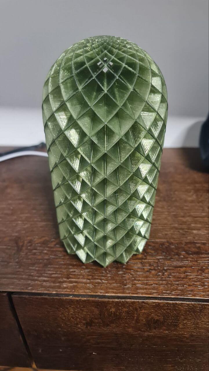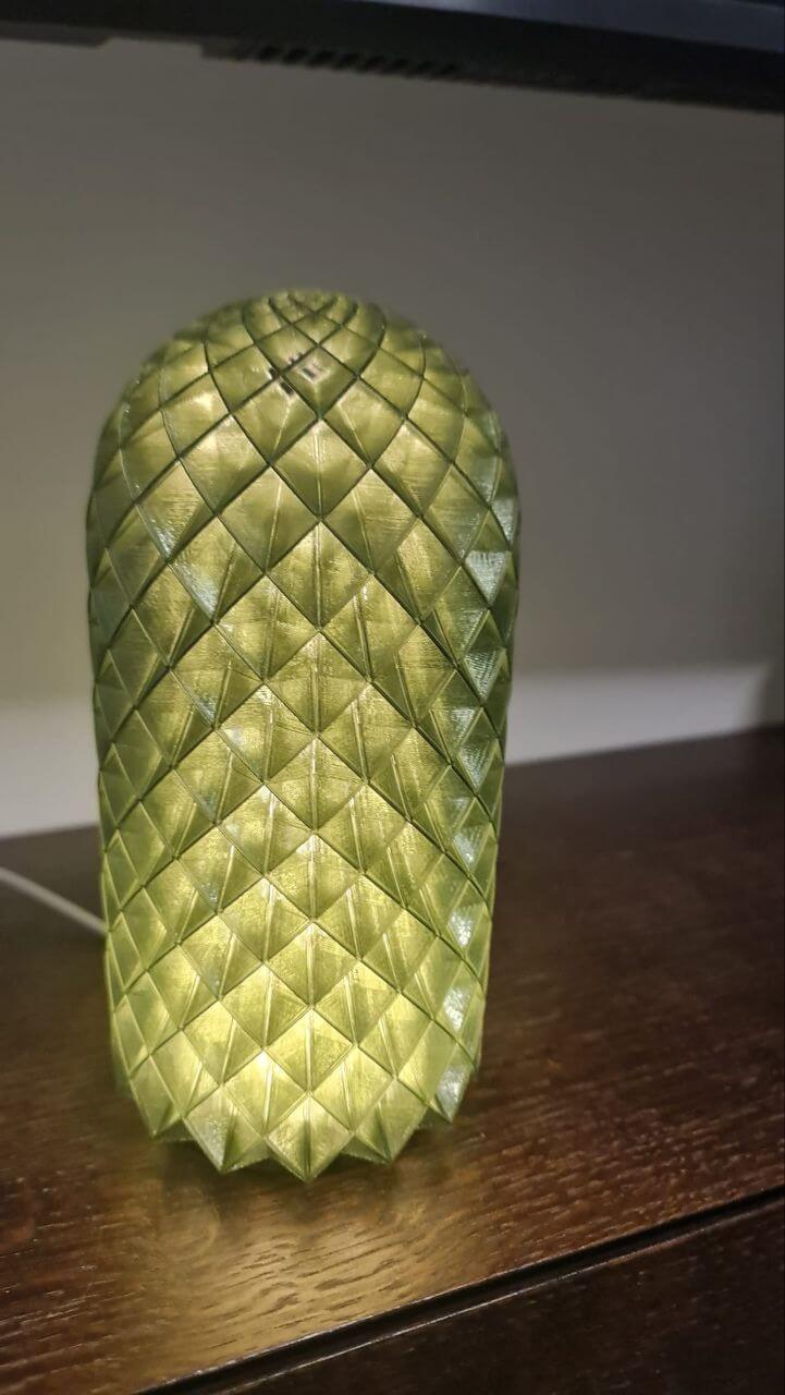 Kratak opis Ovalna lampa sa reljefnim ananas uzorkom. Meka zelena topla svetlost kroz detaljan reljef daje tropski, umirujući sjaj. Idealna za policu, noćni sto ili dekor.